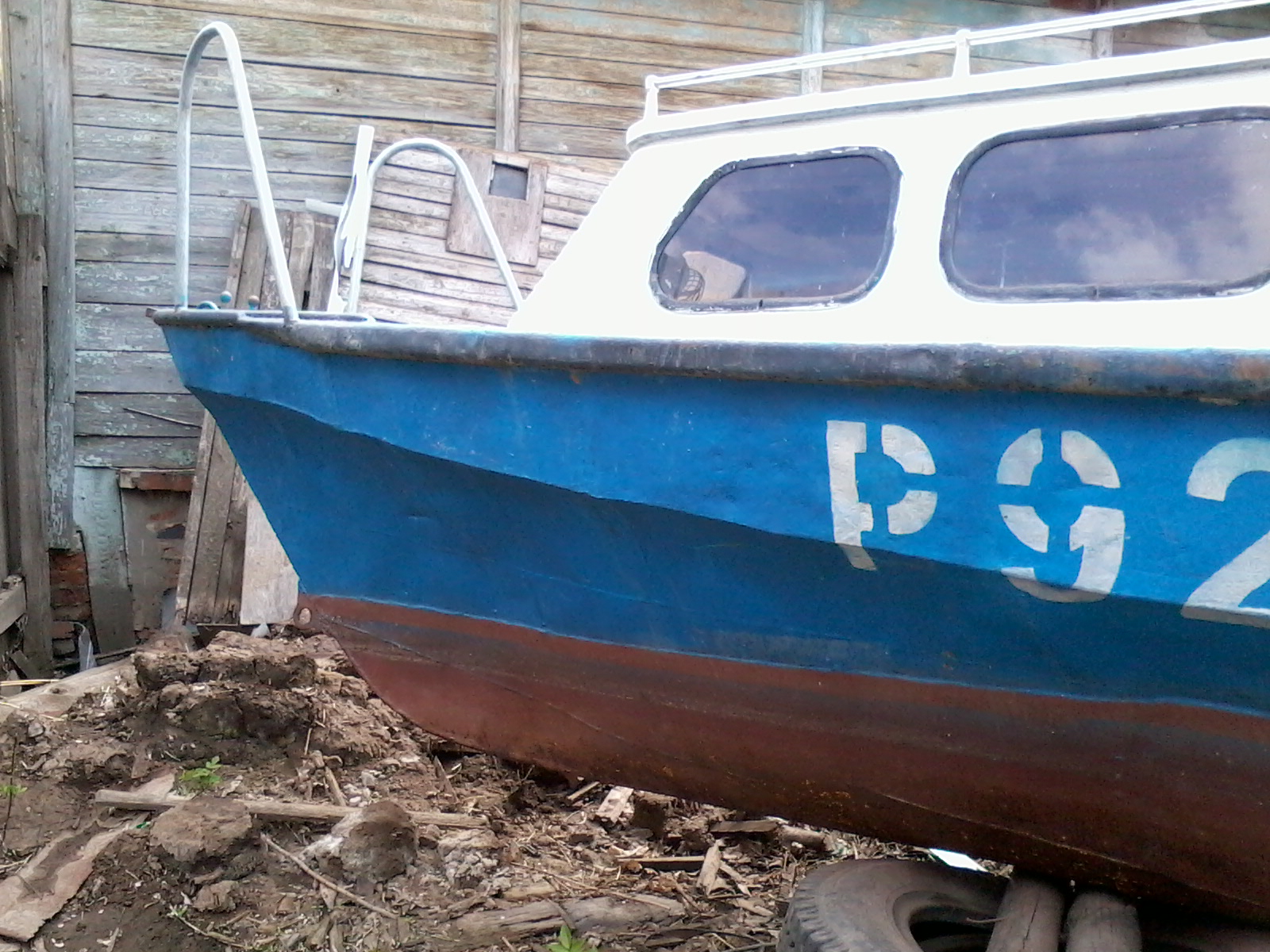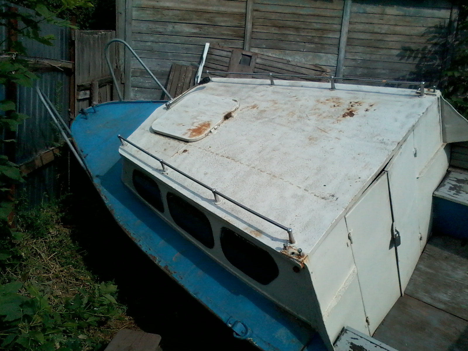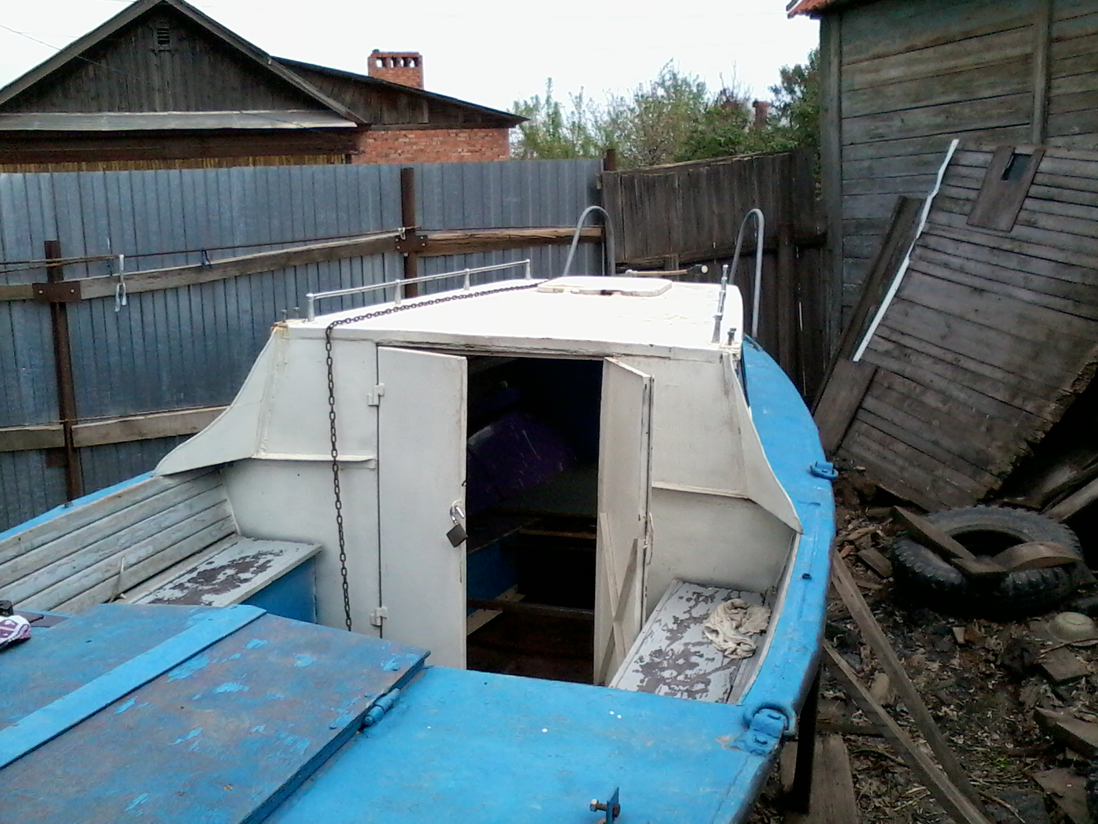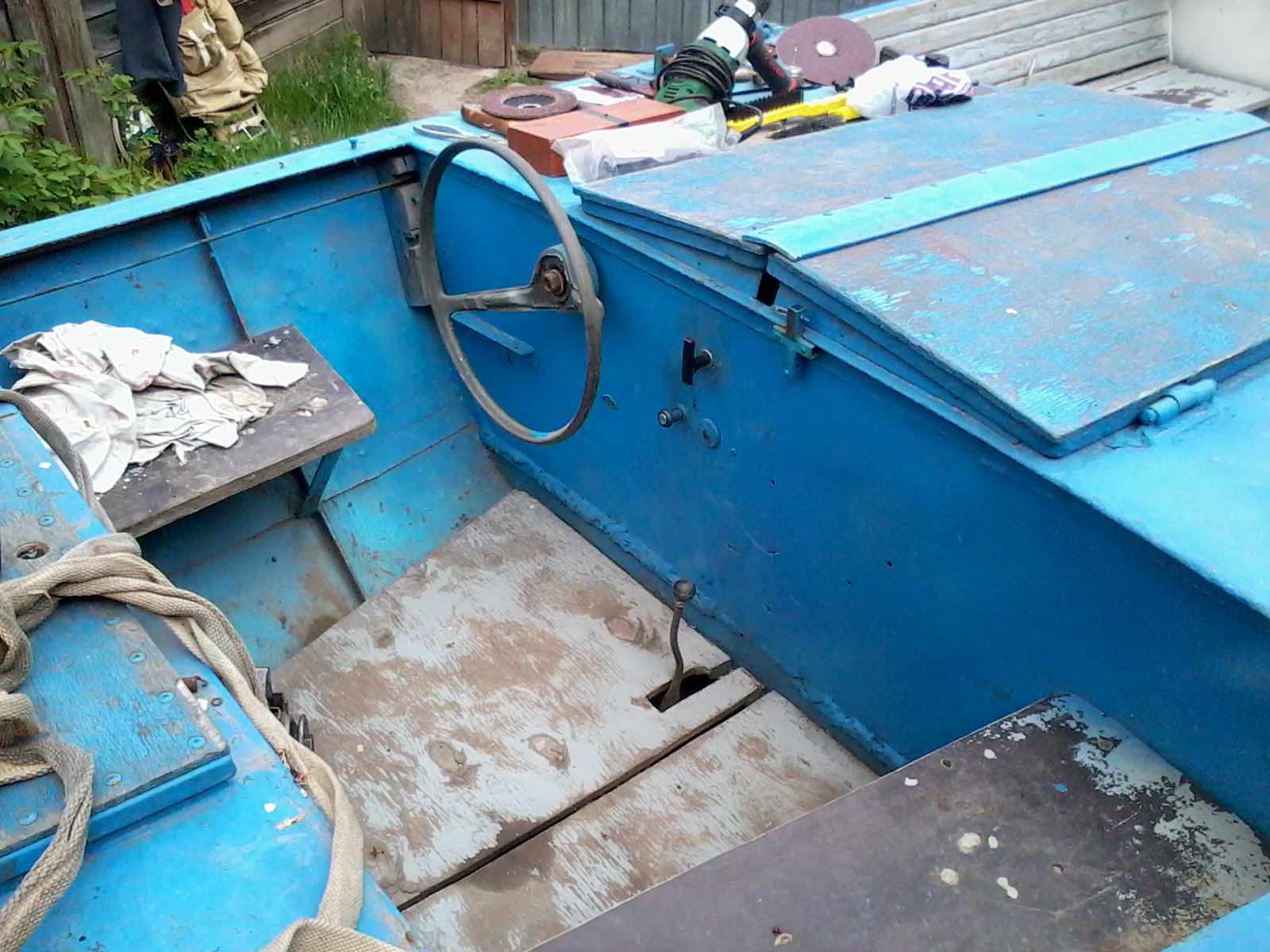 на Сэйле, плюнул на поездки, вооружился болгаркой, кучей разнообразного краскоотдирательного инструмента и ведёрком абразивов и поскакал в Энгельс. После снятия полиэтилена, лишних досок, вычерпывания талой воды (зато видно, что не течет!) и легкого приведения в порядок перед глазами предстала лодка.
