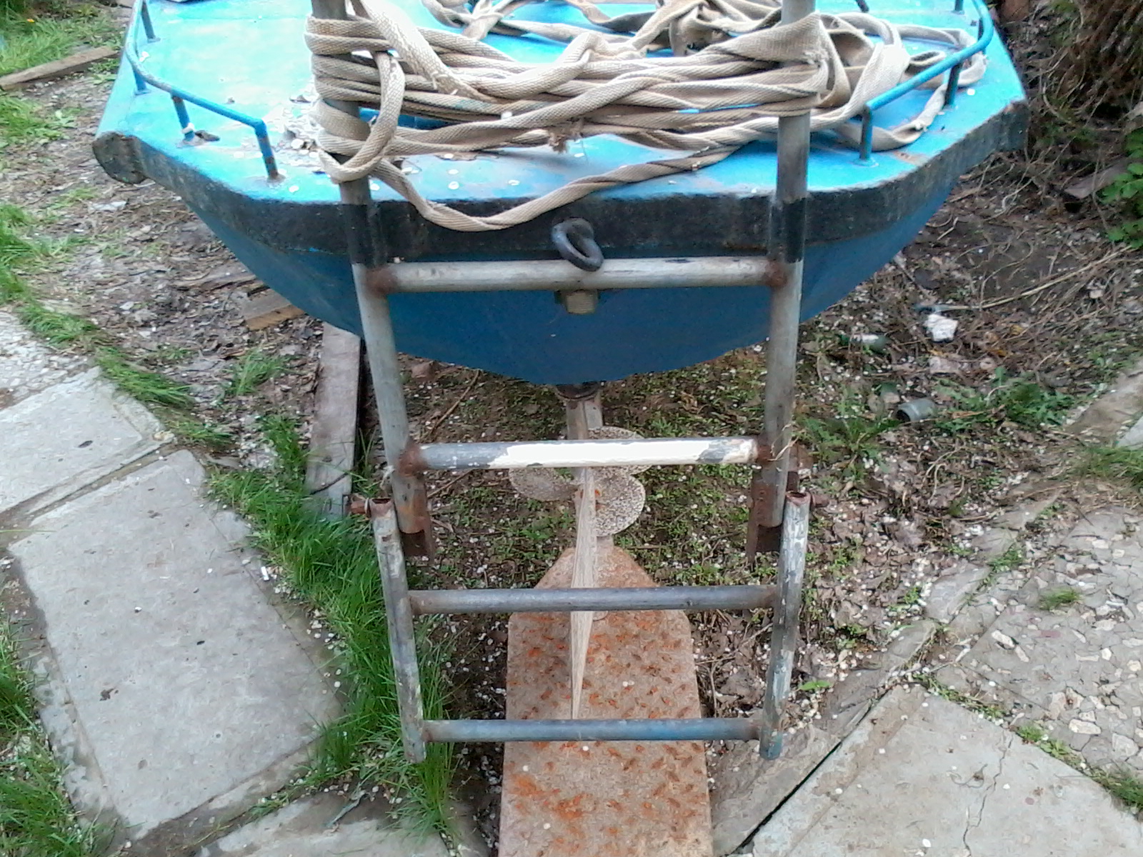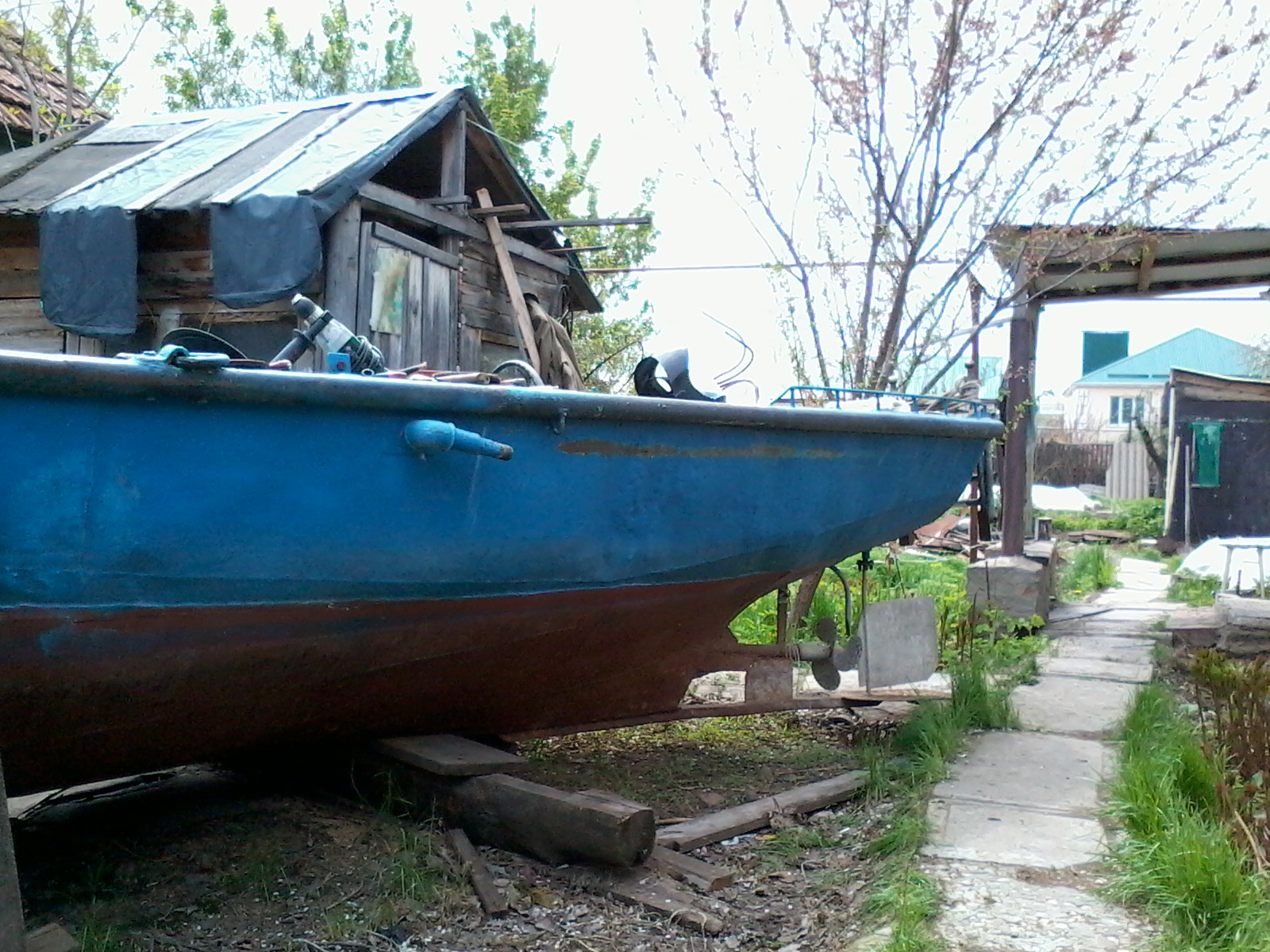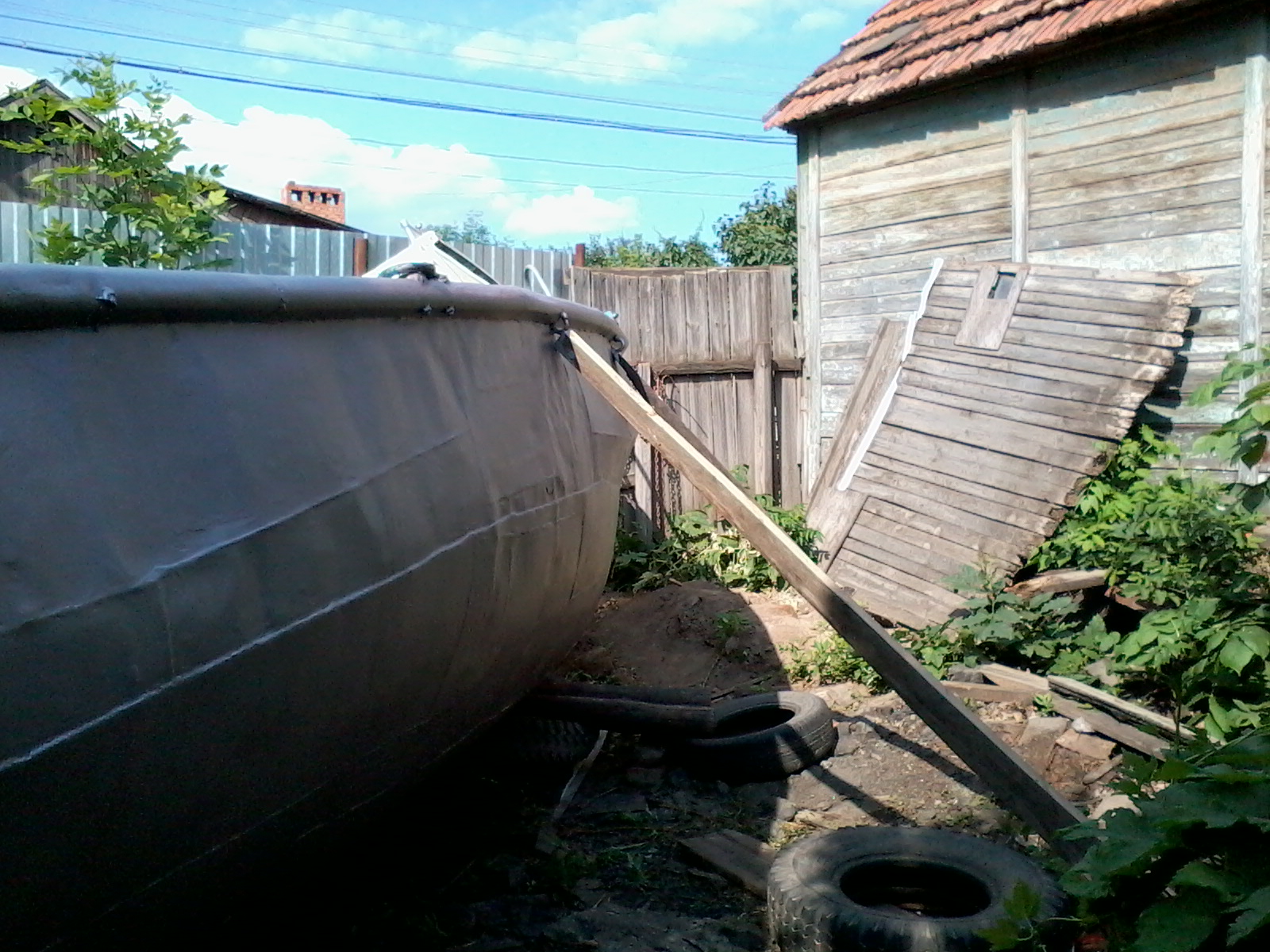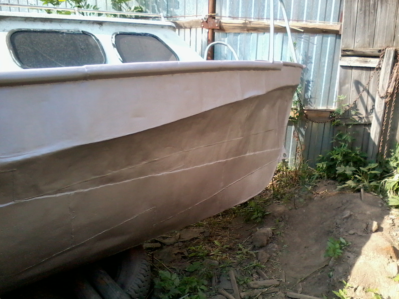 на Сэйле, плюнул на поездки, вооружился болгаркой, кучей разнообразного краскоотдирательного инструмента и ведёрком абразивов и поскакал в Энгельс. После снятия полиэтилена, лишних досок, вычерпывания талой воды (зато видно, что не течет!) и легкого приведения в порядок перед глазами предстала лодка.